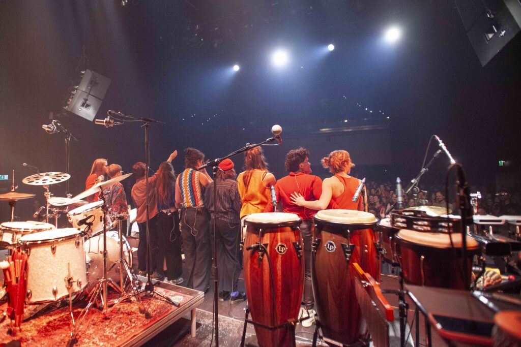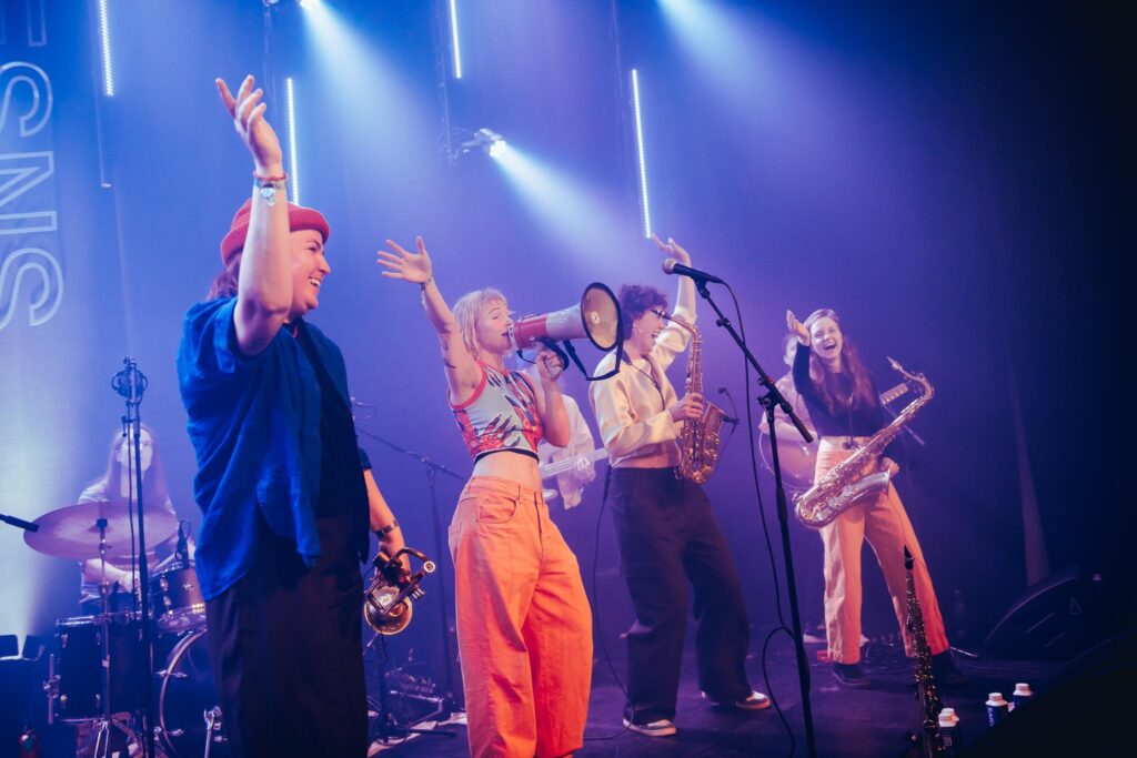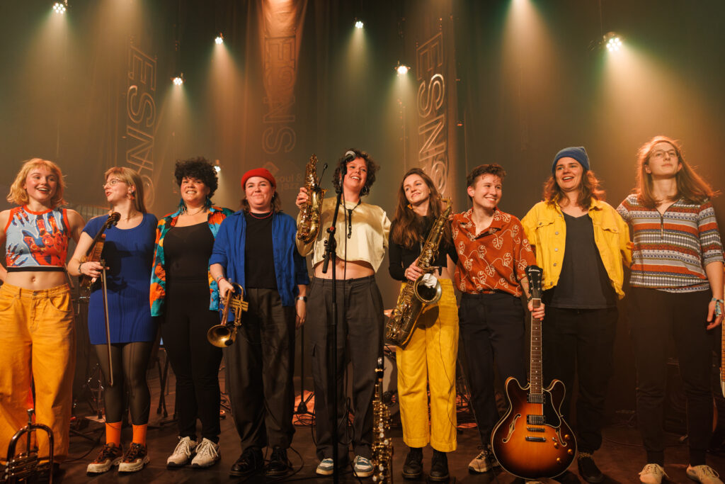 “Dit negenkoppige collectief van vrouwen en non-binaire muzikanten zet muzikaal in op grensvervaging: blazers, viool en een stevige ritmesectie mengen jazz, funky hiphop, Zuid-Amerikaanse en Midden-Oosterse invloeden tot dansbare grooves. Vanaf de eerste nummers zet de groep in op beweging; publieksinteractie zorgt ervoor dat de tent zich snel vult en alledaagse scheidslijnen vervagen in gezamenlijke ritmes.